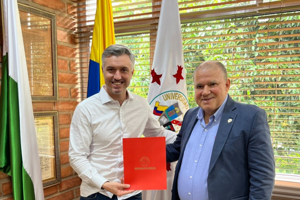 Presidente do Confea, Vinicius Marchese, e o reitor da Universidade de Medelim, Néstor Raúl Posada Arboleda. Créditos: Arquivo Confea