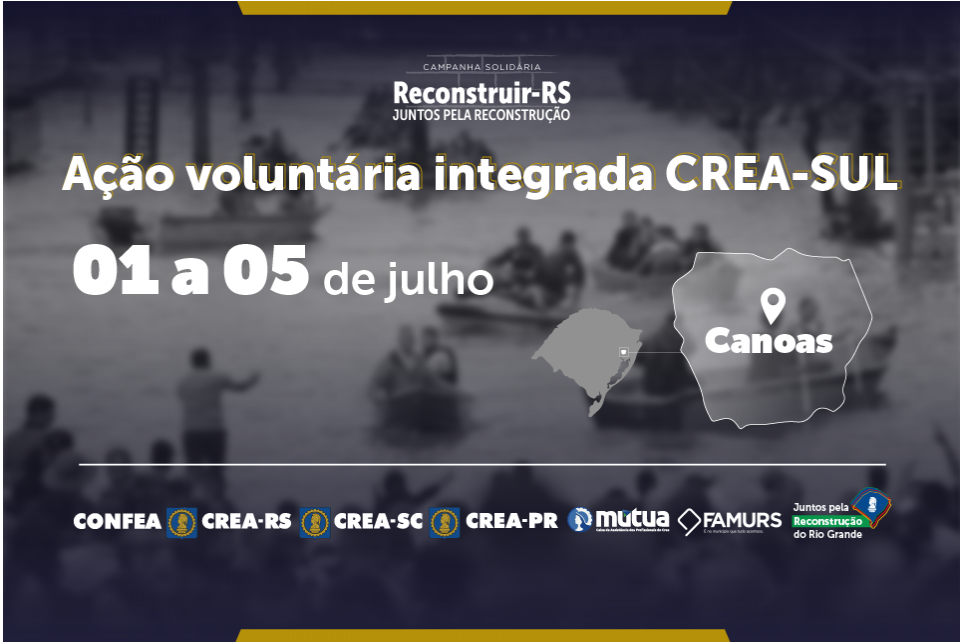 A ação demandará um grande número de profissionais voluntários, e contará com o apoio do CREA-SC, CREA-PR e seus inscritos em nosso programa de voluntariado, residentes em Santa Catarina e no Paraná. Eles percorrerão mais de 700 km na manhã desta segunda-feira (1/7) para se juntar aos profissionais voluntários gaúchos.