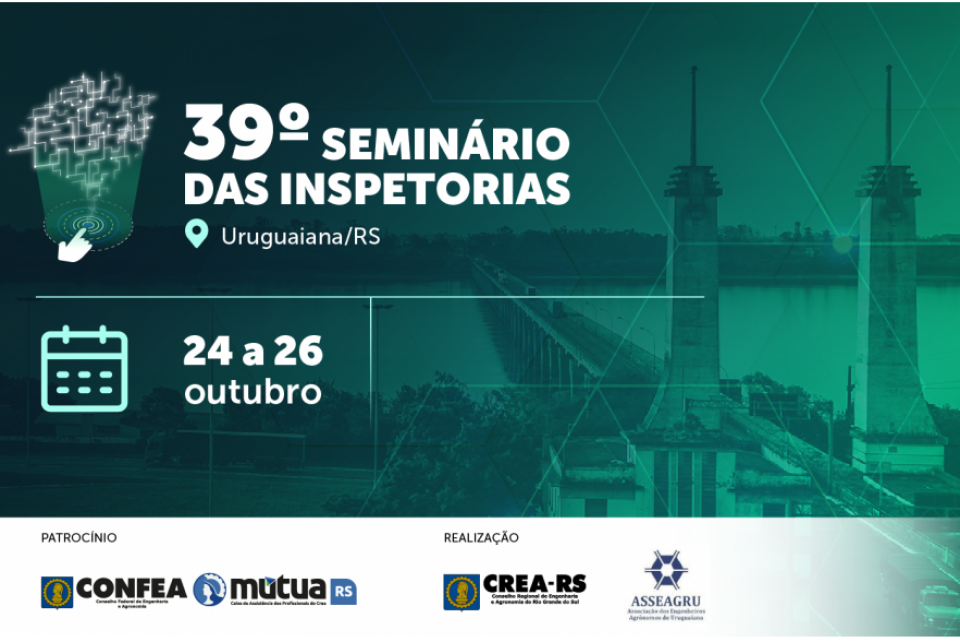 O 39º Seminário das Inspetorias do CREA-RS será realizado em Uruguaiana entre os dias 24 e 26 de outubro de 2024. Este evento anual reúne representantes das 44 regionais do Conselho Regional de Engenharia e Agronomia do Rio Grande do Sul (CREA-RS), com o objetivo de debater ações e a atuação das inspetorias, visando a melhoria contínua das atividades do Conselho em todo o estado. O evento conta com o patrocínio do Confea e da Mútua-RS, e a parceria da Associação dos Engenheiros Agrônomos de Uruguaiana.
