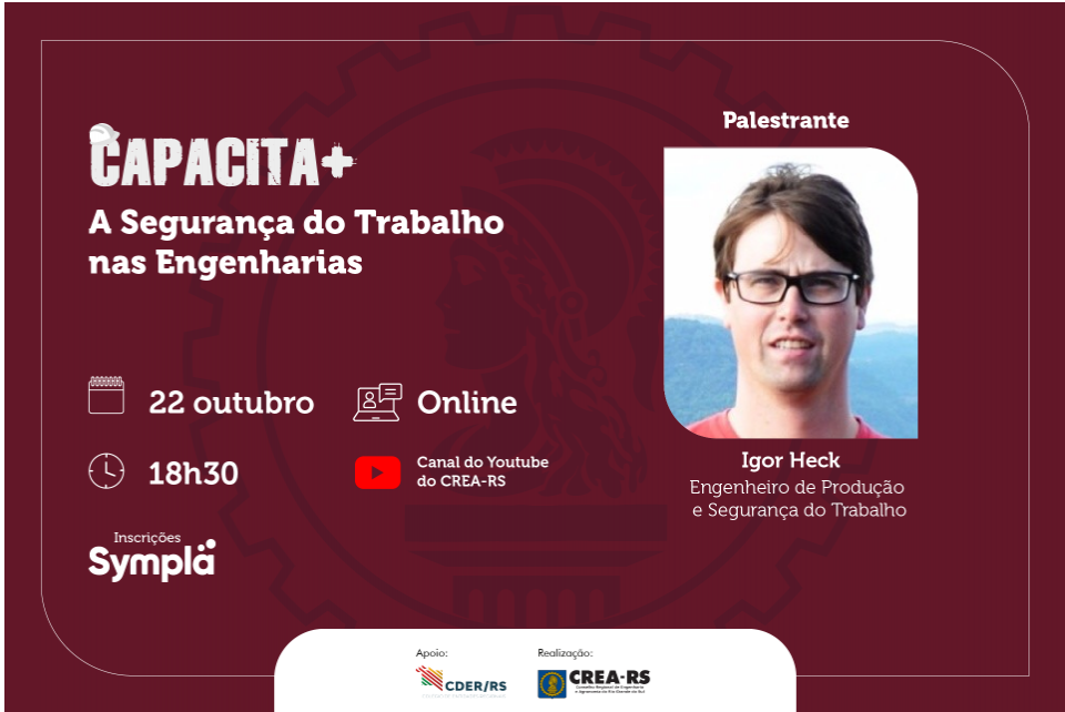 O Programa CAPACITA+ da noite desta terça-feira (22) trouxe a segurança do trabalho ao debate transmitido ao vivo pelo You Tube CREA-RS. O palestrante foi o Eng. Prod. e Seg. Trab. Igor Heck, profissional com experiência de 20 anos em indústrias multinacionais e empresa prestadora de serviços na área de Segurança do Trabalho.