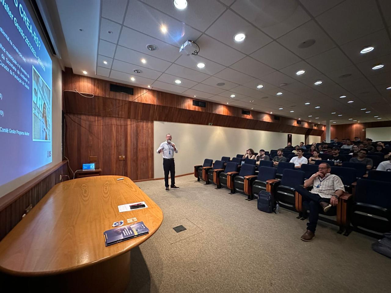 Para uma plateia atenta, o gestor institucional Eng. Prod. Mec. e Seg. do Trab. Fábio Chaves, representando a presidente Eng. Amb. Nanci Walter, falou aos alunos sobre a importância do Conselho para os profissionais, empreendedorismo e, também, apresentou o CREA Jr, programa voltado aos estudantes implantado no RS na gestão da presidente.