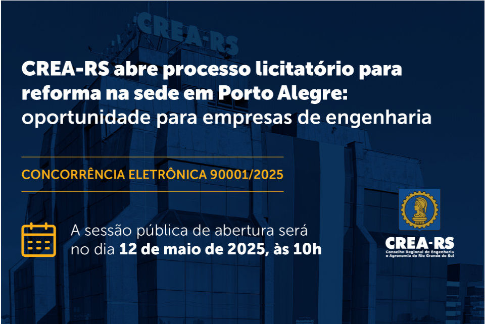 O Conselho Regional de Engenharia e Agronomia do Rio Grande do Sul (CREA-RS) lançou, nesta quinta-feira (24), o Edital nº 90001/2025, que abre um processo licitatório para a reforma completa do térreo e do mezanino da sede do Conselho, localizada em Porto Alegre. A iniciativa reforça o compromisso da atual gestão com a valorização das Engenharias e o aprimoramento da estrutura de atendimento aos profissionais do sistema.