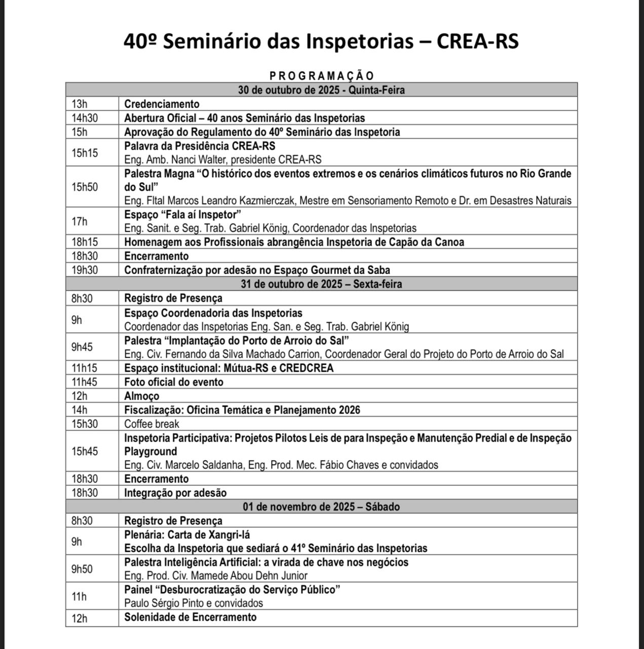 A programação inicia com a palestra “O histórico dos eventos extremos e os cenários climáticos futuros no Rio Grande do Sul”, ministrada pelo engenheiro florestal Marcos Kazmierczak, mestre em Sensoriamento Remoto e doutor em Desastres Naturais. O Seminário contará ainda com homenagens a profissionais da abrangência da Inspetoria de Capão da Canoa, anfitriã desta edição, palestra sobre a implantação do Porto de Arroio do Sal e apresentação sobre projetos-piloto de leis de Inspeção Predial e Inspeção de Playground, no momento Inspetoria Participativa.