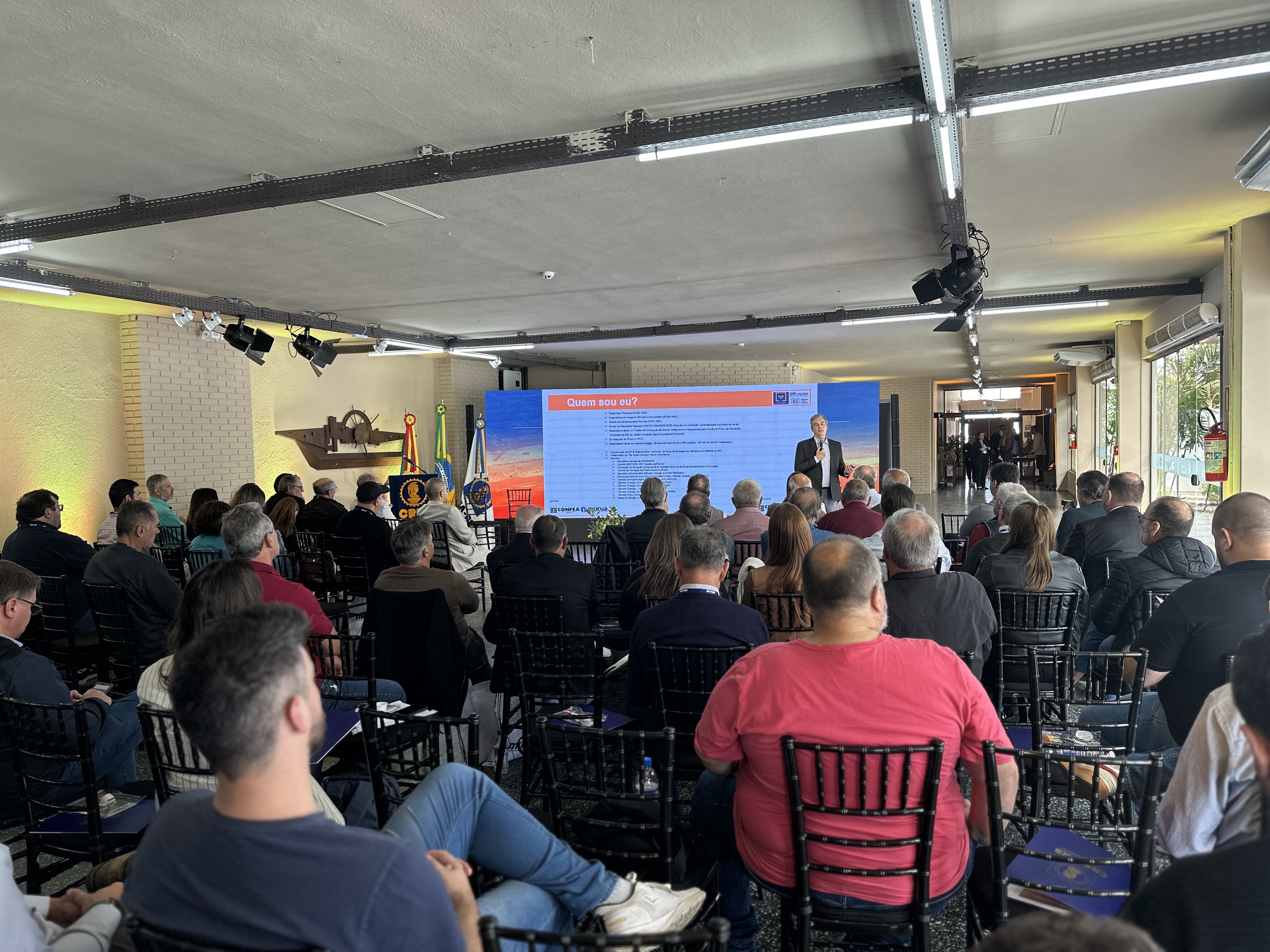 Com essas provocações, o Eng. Fltal Marcos Leandro Kazmierczak, mestre em Sensoriamento Remoto e doutor em Desastres Naturais, começou a sua palestra magna com o tema O Histórico dos Eventos Extremos e os Cenários Climáticos Futuros no Rio Grande do Sul.