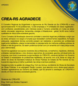 O CREA-RS publica nos jornais de grande circulação do Estado, neste sábado (18), um anúncio em agradecimento aos apoios recebidos dos profissionais, conselheiros, inspetores, diretores, entidades representativas e dos diversos segmentos da sociedade gaúcha, principalmente da imprensa, que foram sensíveis à argumentação do CREA-RS, cobrando também do Governo do Estado a necessidade de profissionais habilitados, de acordo com a lei, frente ao cargo de diretor de obras da Secretaria Estadual de Obras Públicas do Estado do Rio Grande do Sul, buscando melhor qualidade dos serviços públicos.