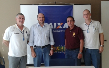 Os agentes fiscais Marcelo Elesbão Fontoura e Luiz Batista Rossignollo Roggia, juntamente com o presidente em exercício, Eng. Agr. Juarez Morbini Lopes, estiveram reunidos, no último dia 21, com o Superintendente Regional da Caixa Econômica Federal, Júlio Cesar da Silva Pavin, para tratar de questões pertinentes ao crédito rural.