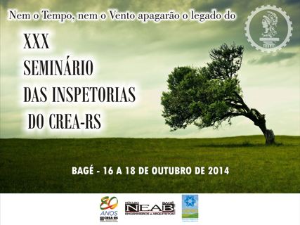 De 16 a 18 de outubro, a cidade de Bagé recebe a 30ª edição do Seminário das Inspetorias do Conselho Regional de Engenharia e Agronomia do RS (CREA-RS), que acontecerá no Anfiteatro do Museu Dom Diogo de Souza - Urcamp. Esse evento se constitui na reunião anual das Inspetorias do CREA-RS e tem como objetivos contribuir com o processo de análise sobre questões de interesse dos profissionais do Sistema Confea/Crea e Mútua; contribuir para a efetiva inserção dos profissionais do Sistema junto à sociedade; fomentar a discussão junto às Inspetorias para ações políticas, visando a descentralização; discutir e divulgar os rumos do Conselho para a partir de 2015; e discutir a legislação atinente aos profissionais do Sistema Confea/Crea e Mútua. Participam do Seminário o Coordenador e Coordenador Adjunto das Inspetorias, representantes das Zonais, inspetores, representantes das Câmaras na Coordenadoria e a diretoria do CREA-RS.