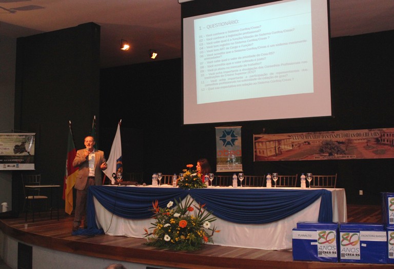 “As ações de aproximação entre os professores e as instituições de ensino e o CREA-RS precisam ser mais efetivas.” Com este alerta o professor e Engenheiro Florestal Pedro Roberto Madruga iniciou a apresentação do trabalho “Análise do Nível de Satisfação dos Profissionais da Área Tecnológica em Relação ao CREA-RS visando a Proposição de Inovações dos Serviços”. Produzido em parceria com a inspetora-secretária de Alegrete, a Eng. Civil Adriana Gindri Salbergo, o trabalho foi o único de engenheiros gaúchos selecionado e apresentado no I Congresso Técnico e Científico da Engenharia e da Agronomia (Contecc 2014), realizado durante a 70ª Semana Oficial de Engenharia e Agronomia (70ª SOEA), ocorrida em setembro, no Piauí.