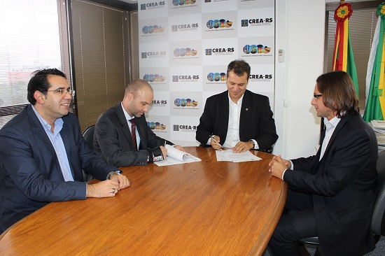 CREA-RS e o Ministério Público do Trabalho no Rio Grande do Sul (MPT-RS) firmaram um termo de cooperação técnica na última sexta-feira (27). O documento foi assinado pelo presidente do CREA-RS, Eng. Civ. Melvis Barrios Junior, pelo vice-presidente do Conselho, Eng. Civ. Fernando Martins Pereira da Silva, pelo procurador-chefe do MPT-RS, Fabiano Holz Beserra, e pelo procurador-chefe adjunto do MPT-RS, Rogério Uzun Fleischmann. A assinatura formaliza parceria entre os órgãos, já em curso em fiscalizações em setores como o da construção civil, no município de Caxias do Sul, e na força-tarefa que inspeciona os frigoríficos gaúchos desde 2014.