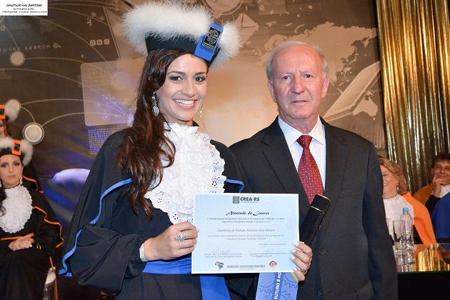 Na foto,Trevisan entregando certificado à aluna destaque, com melhores notas de avalição durante o curso. Créditos: Arquivo CREA-RS