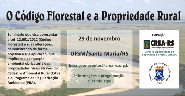 Devido a importância do tema para os profissionais do Sistema Confea/Crea, o Código Florestal será tema de novo evento com promoção da Comissão Especial de Meio Ambiente (Coema) e da Câmara Especializada de Engenharia Florestal do CREA-RS, a ocorrer no dia 29 de novembro, das 13h30 às 18 horas. O encontro será em Santa Maria, no Auditório de Centro de Ciências Rurais da UFSM.