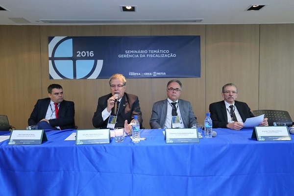 Ao lado do conselheiro federal pelo Rio Grande do Sul, Geólogo e Eng. Seg. Trab. Pablo Souto Palma, Carlos das Neves e Célio Moura, Paulo Roberto Lucas Viana, o conselheiro federal do Confea que também coordena a Comissão de Ética e Exercício Profissional (Ceep), deu as boas-vindas aos 54 participantes do Seminário Temático Gerência da Fiscalização, que ocorre hoje (19) e amanhã (20) na sede do Conselho Federal de Engenharia e Agronomia (Confea), em Brasília. O presidente do Confea, José Tadeu da Silva, também falou aos gerentes de fiscalização do Sistema Confea/Crea. Dada a importância da atividade fim dos Creas, a fiscalização, ele lembrou que das 4 mil profissões existentes, no Brasil, apenas 30 são regulamentadas, e que tanto o Congresso quanto o Governo Federal resistem ao reconhecimento de novas profissões. José Tadeu também defendeu que atividades profissionais devem ser exercidas com base nos estudos teóricos e práticos da formação profissional, e ainda uma “nova visão, nova filosofia sobre a fiscalização”, além de criticar a atuação dos chamados “canetinhas”, quando um profissional empresta sua assinatura para um leigo ou mesmo para estudantes ainda em formação.