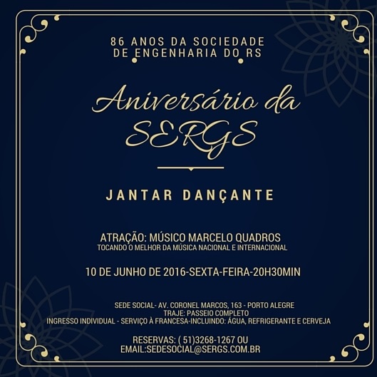A partir das 20h30, do dia 10 de junho, ocorre o evento de comemoração ao aniversário da entidade da área tecnológica mais antiga do Estado, a Sergs. A Sede Social da entidade, situada na zona sul de Porto Alegre, receberá profissionais da área, autoridades, entidades e amigos para celebrar a data. O evento, intitulado de Jantar Dançante, terá a atração musical de Marcelo Quadros, tocando o melhor da música nacional e internacional, além de um jantar à francesa e bebidas.