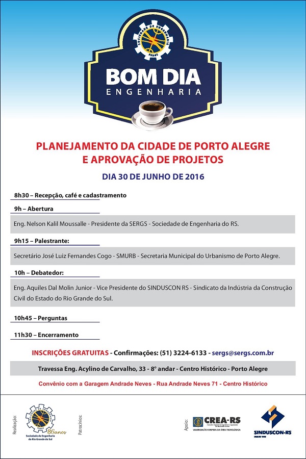 O tradicional "Bom Dia Engenharia" da Sergs debate no próximo encontro, dia 30 de junho, na Sede Central da Entidade, o tema "Planejamento da Cidade de Porto Alegre e Aprovação de Projetos". O evento inicia as 8h30min e segue até às 11h30min. A apresentação será feita pelo presidente da Sergs, o Eng. Nelson Kalil Moussalle.