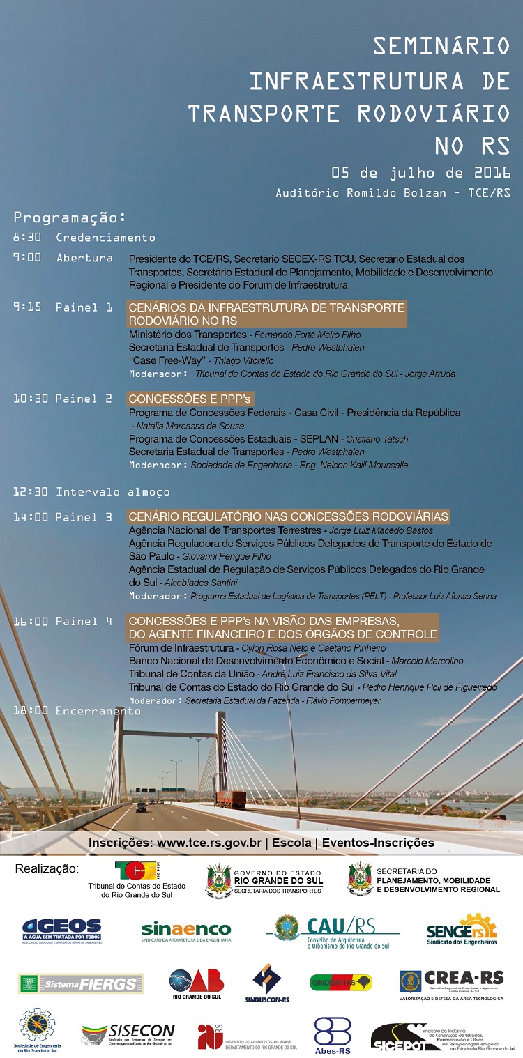 O Seminário é uma promoção conjunta do Tribunal de Contas do Estado (TCE), do Governo do Estado do RS - por meio da Secretaria dos Transportes e da Secretaria do Planejamento, Mobilidade e Desenvolvimento Regional - e do Fórum de Infraestrutura das Entidades de Engenharia.