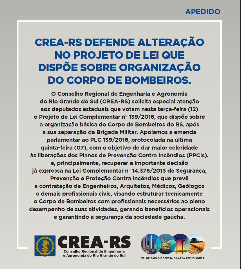 Acompanhe a votação em http://www.al.rs.gov.br/site/ e defenda junto com o CREA-RS o PLC 139/2016 com a alteração que dispõe sobre a organização do Corpo de Bombeiros Militar do Estado relacionada à implementação do quadro de oficiais especialistas da Corporação.