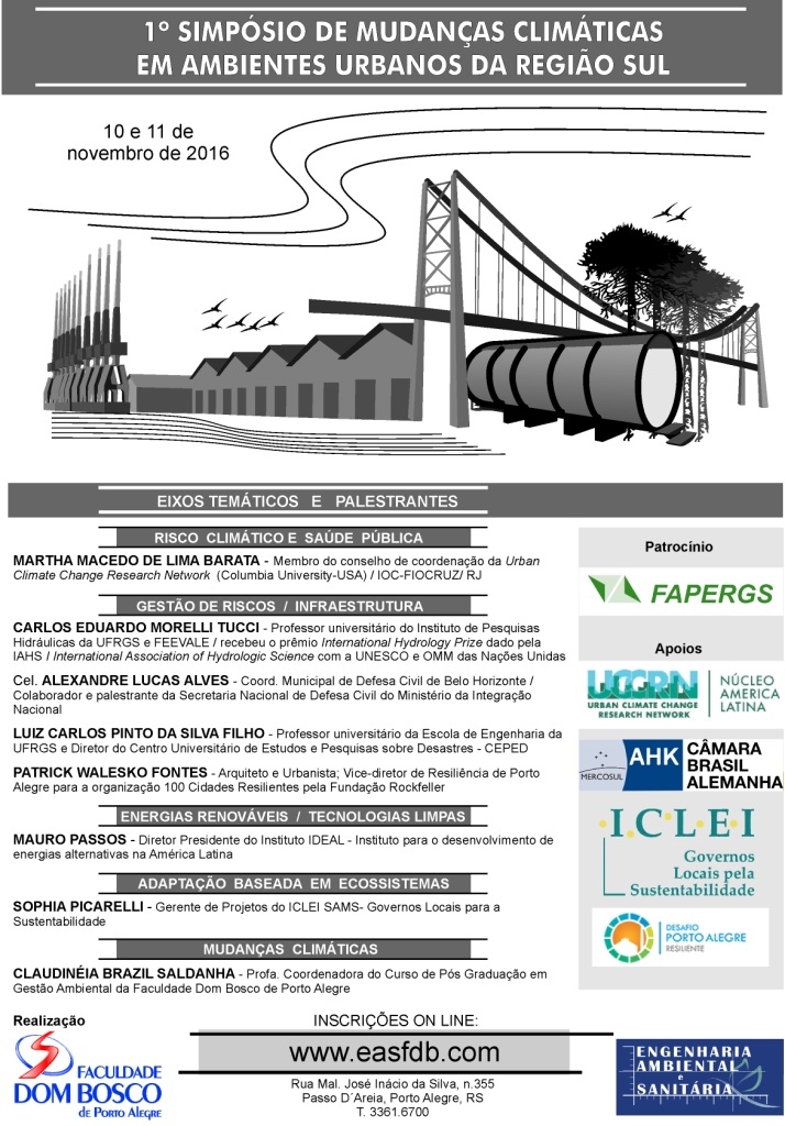 O 1º Simpósio de Mudanças Climáticas em Ambientes Urbanos da Região Sul irá reunir, nos dias 10 e 11 de novembro, na Faculdade Dom Bosco de Porto Alegre, pesquisadores e profissionais de diversas áreas do conhecimento para discutir os impactos, as medidas mitigadoras e também os processos viáveis que permitam a adaptação das cidades a esse fenômeno.