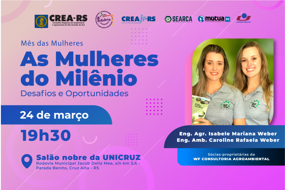 O CREA-RS, através do Programa Mulher, do CREAjr-RS e da Inspetoria de Cruz Alta, junto à Sociedade dos Engenheiros Agrônomos da Região de Cruz Alta, à Mútua e à Unicruz, promove o encontro As Mulheres do Milênio: Desafios e Oportunidades, com um bate-papo com as sócias-proprietárias da WF Consultoria Agroambiental, Engenheira Agrônoma Isabele Mariana Weber e a Engenharia Ambiental Caroline Rafaela Weber.