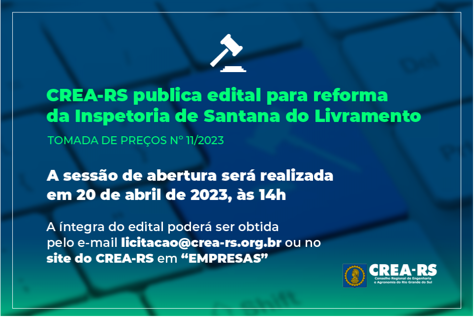 O CREA-RS publicou Edital de Tomada de Preço para contratação de empresa em regime de empreitada por preço geral para reforma da Inspetoria de Santana do Livramento.