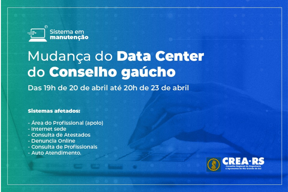 O Conselho está mudando seu Data Center, sendo assim, das 19h de 20 de abril às 20 horas do dia 23 de abril os sistemas listados abaixo ficarão inoperantes neste período: