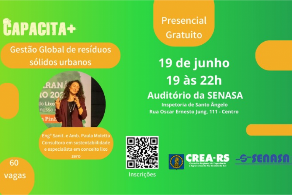 O CREA-RS, com apoio da Sociedade de Engenharia e de Arquitetos de Santo Ângelo ( Senasa), promove o sétimo Capacita+ sob o tema Gestão de Resíduos Sólidos Urbanos.