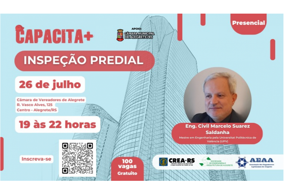 O encontro é no dia 26 julho, na Câmara de Vereadores de Alegrete, Rua Vasco Alves, 125, das 19 às 22 horas. As inscrições são pelo Sympla https://www.sympla.com.br/evento/capacita-palestra-tecnica-inspecao-predial/2032826