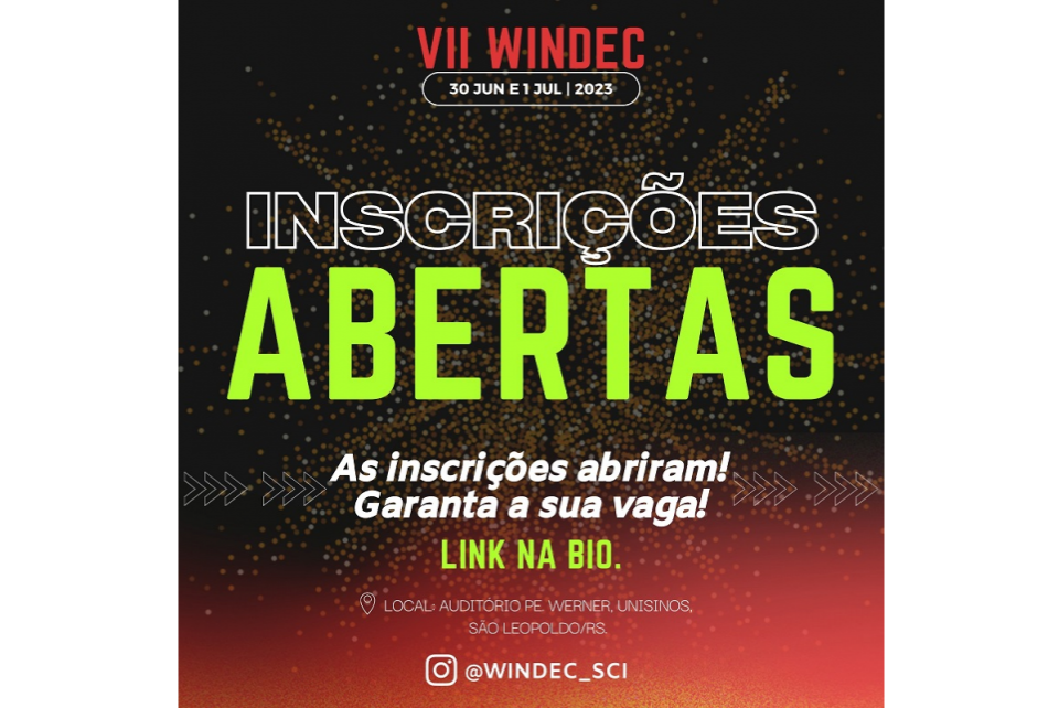 O evento acontecerá no auditório Padre Werner, Unisinos, São Leopoldo/RS. Confira a programação no Instagram @WINDEC_SCI.