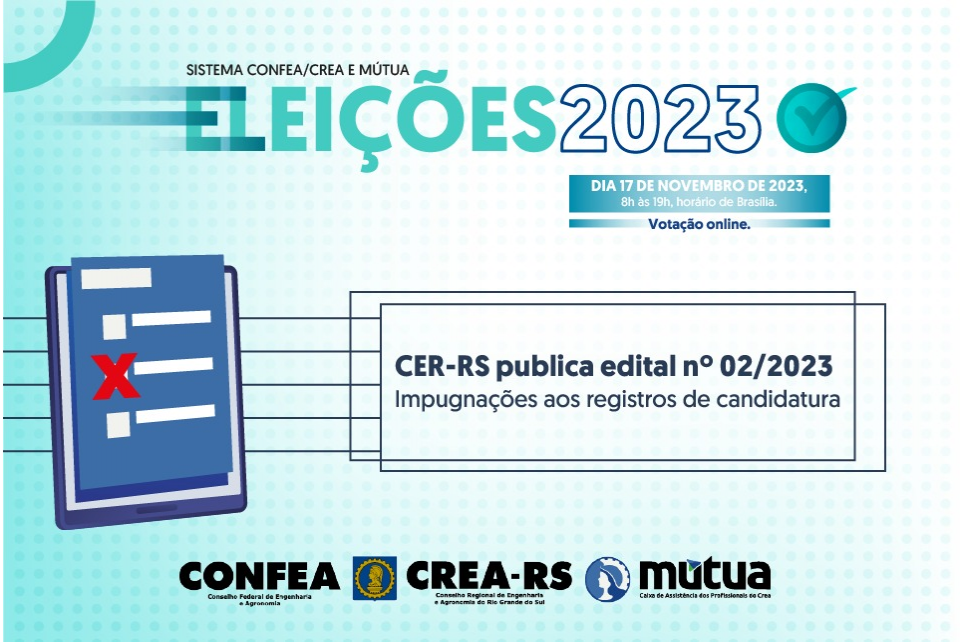 A Comissão Eleitoral Regional (CER-RS), instituída pelo Conselho Regional de Engenharia e Agronomia no Estado do Rio Grande do Sul/RS, por meio da Decisão Plenária nº PL/RS-14/2023, em observância ao art. 32, da Resolução nº 1.114, de 2019 - Regulamento Eleitoral, TORNA PÚBLICA a relação de todas as impugnações apresentadas em face dos registros de candidatura, abrindo-se o prazo de 5 (cinco) dias para os candidatos impugnados apresentarem contestação (até 11/09/2023), conforme Calendário Eleitoral.