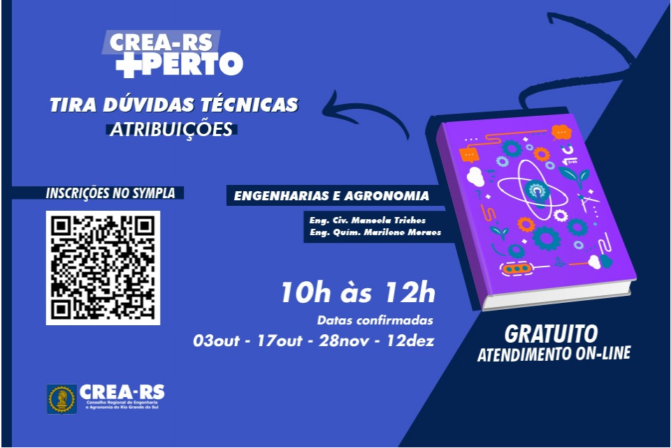 É o CREA-RS+ perto ainda dos profissionais! Quer tirar dúvidas sobre atribuição profissional, então participe do último encontro do ano, nesta terça, às 10 horas, inscrição aqui .