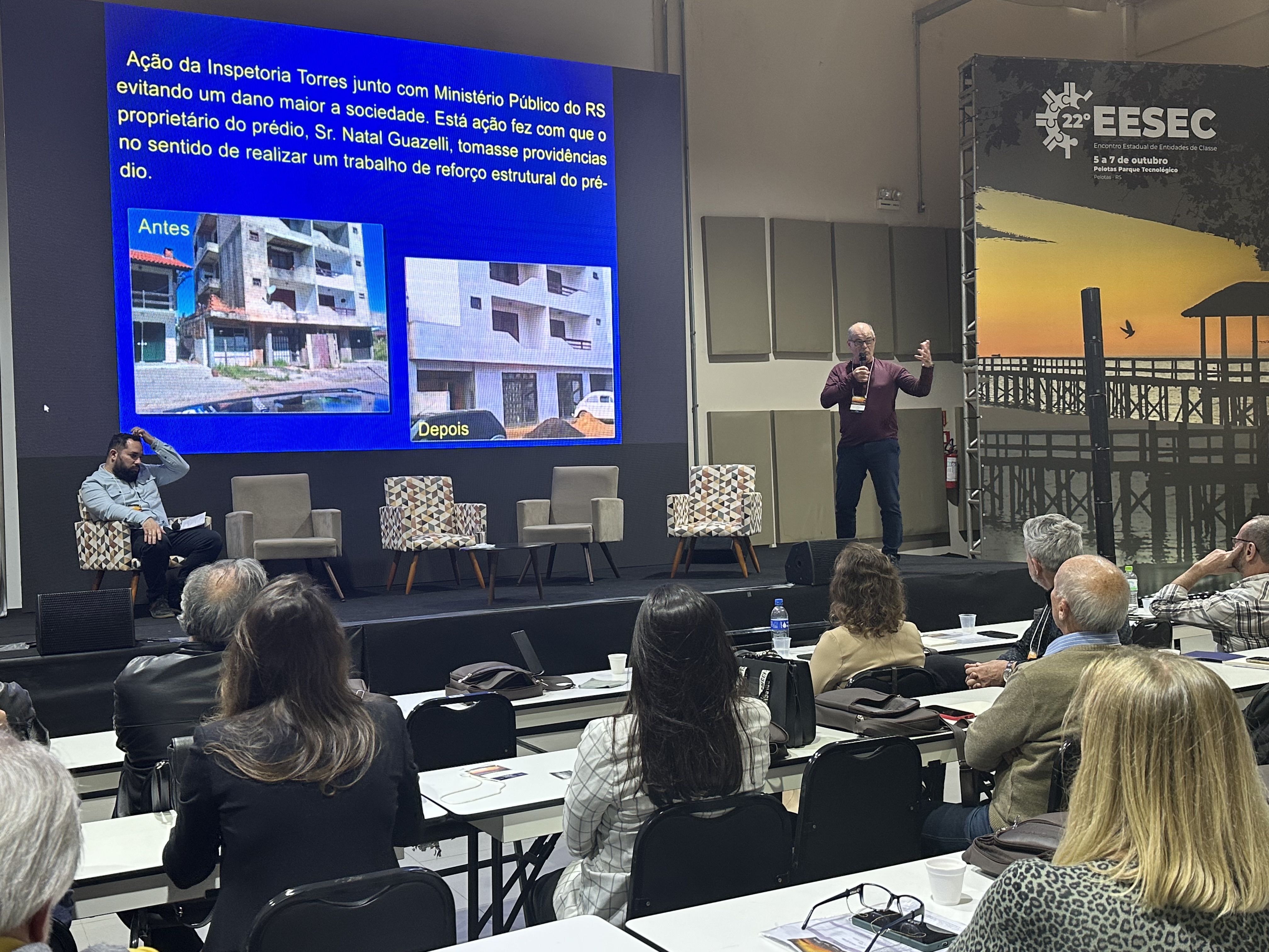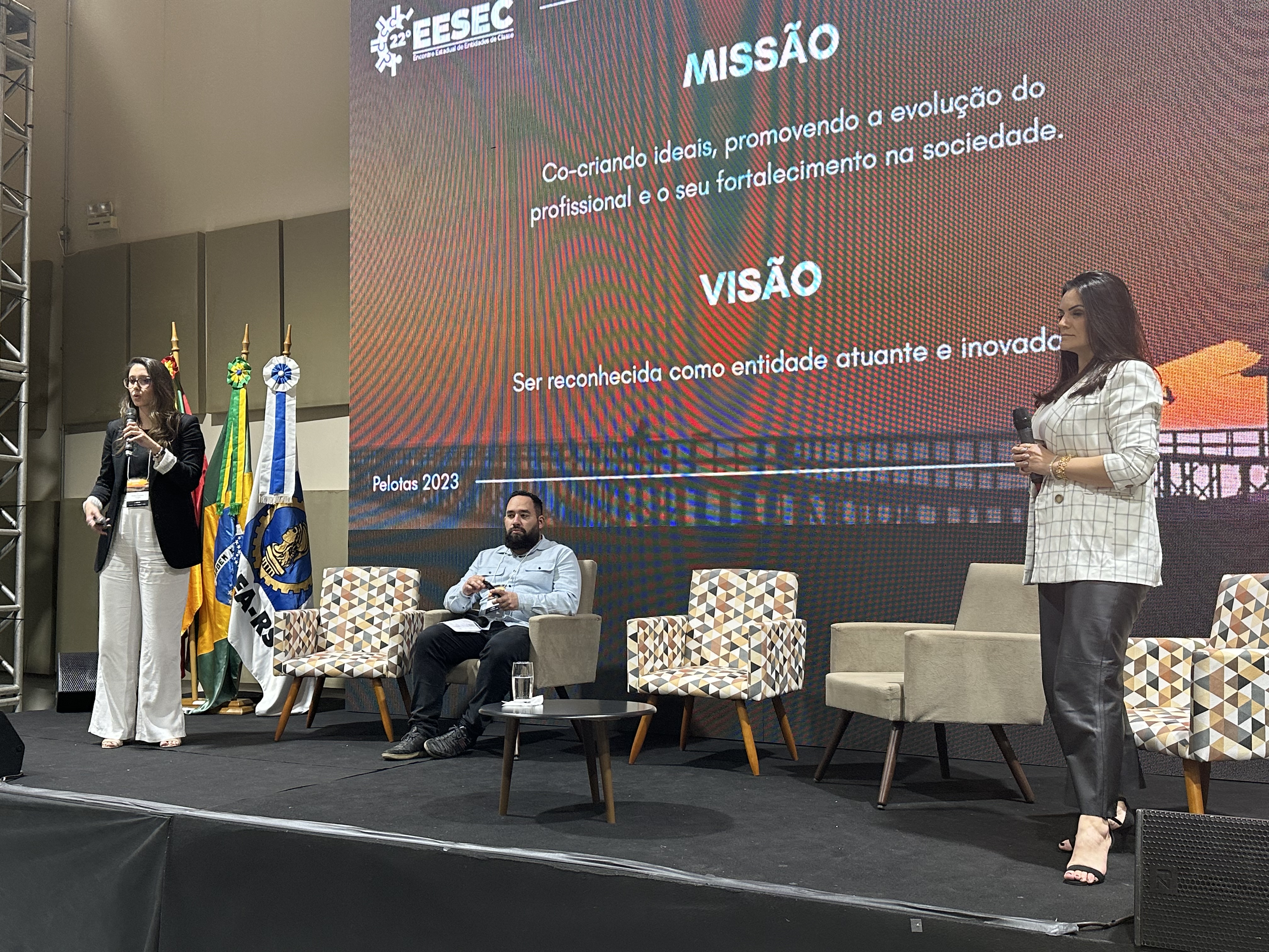 Com condução do coordenador-adjunto do CDER-RS, Eng. Civ. e Seg. Trab. Alex Gustavo Marques Gobbato, representantes de oito entidades subiram ao palco do EESEC na tarde de sexta-feira (06) para apresentar seus cases de sucesso.