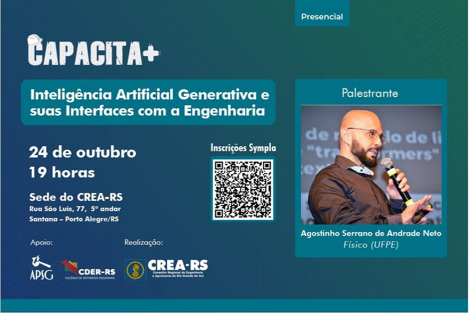 A série CAPACITA+ traz a palestra "Inteligência Artificial Generativa e suas Interfaces com a Engenharia" para Porto Alegre na próxima terça-feira (24) às 19h. Promovido pelo CREA-RS, com apoio do CDER-RS, será ministrada de forma presencial, na sede do Conselho, com carga horária de três horas.