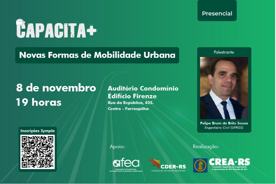 Com apoio da Associação Farroupilhense de Engenheiros, Arquitetos e Agrônomos e do CDER-RS, o evento acontece no dia 08 de novembro, das 19 às 22 horas, no auditório da Escola Municipal de Educação Fundamental.
