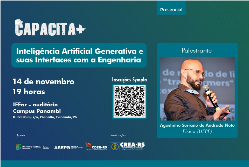 A série CAPACITA+ traz a palestra "Inteligência Artificial Generativa e suas Interfaces com a Engenharia" para Panambi no dia 14 de novembro às 19 horas.