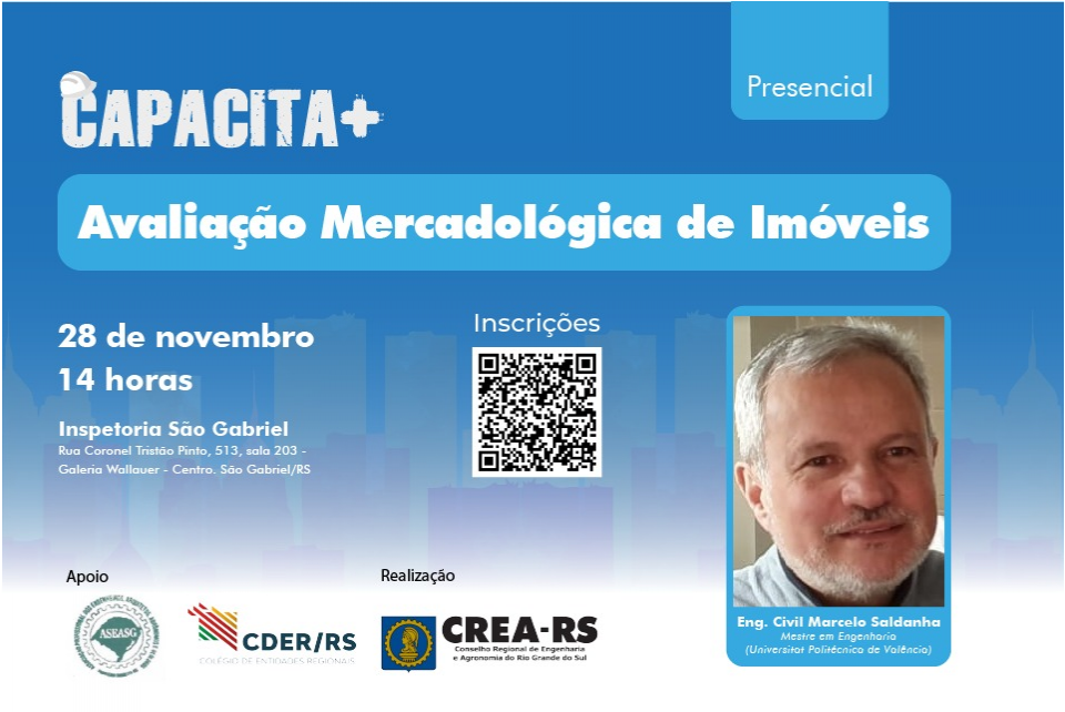 Com o apoio da Associação Profissional de Engenheiros, Agrônomos e Geólogos da Fronteira Sudoeste do Rio Grande do Sul – ASEASG, a série CAPACITA + do CREA-RS chega em São Gabriel com a palestra técnica Palestra Avaliação Mercadológica de Imóveis.