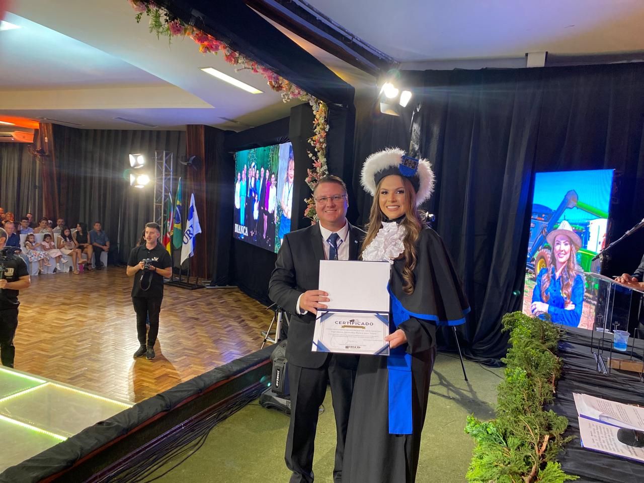 - Em Santiago, a egressa do curso de Agronomia da Universidade Regional Integrada do Alto Uruguai e das Missões – URI Eng. Agr. Bianca Guse Vieira recebeu seu mérito na cerimônia de formatura, em 27/01, do inspetor-chefe em Santiago, Agr. Marcelo Gomes Steiner.