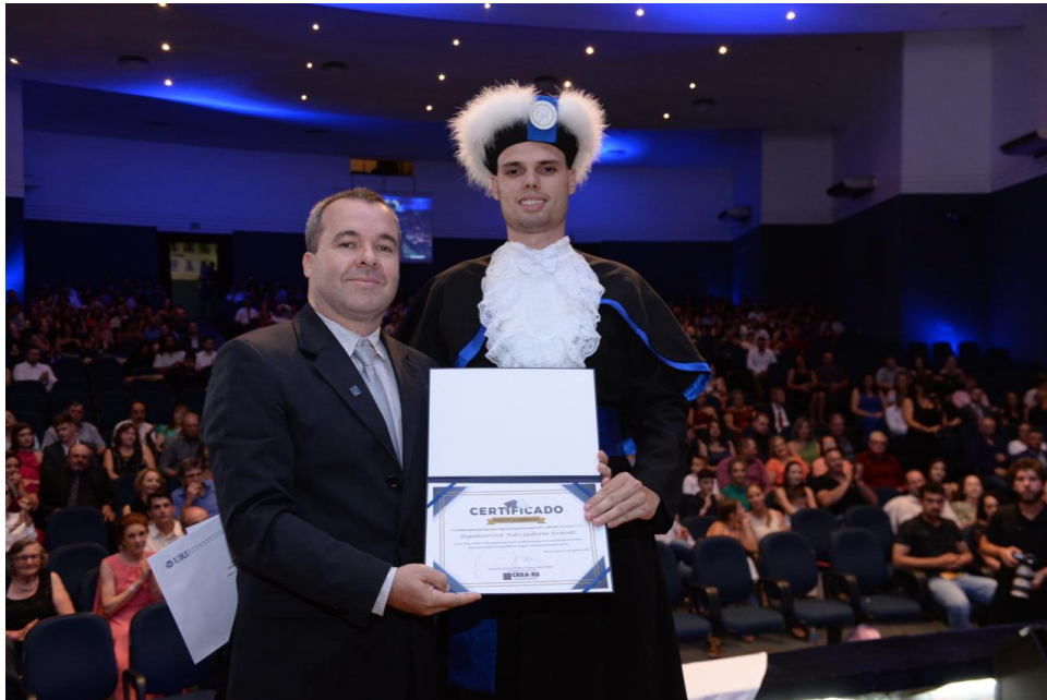 O Engenheiro Civil Pedro Guilherme Fochesatt, formando da URI - Frederico Westphalen, foi o homenageado na colação de grau da turma de Engenharia Civil no dia 27 de janeiro. Por seu desempenho na trajetória acadêmica, recebeu o Certificado de Mérito Acadêmico do CREA-RS do inspetor-chefe da regional na cidade, Engenheiro Civil Juliano Scheneider.