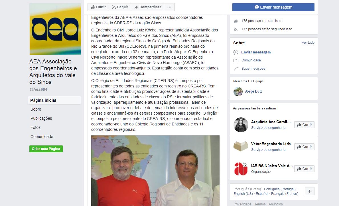 AEA Associação dos Engenheiros e Arquitetos do Vale dos Sinos, página do Facebook